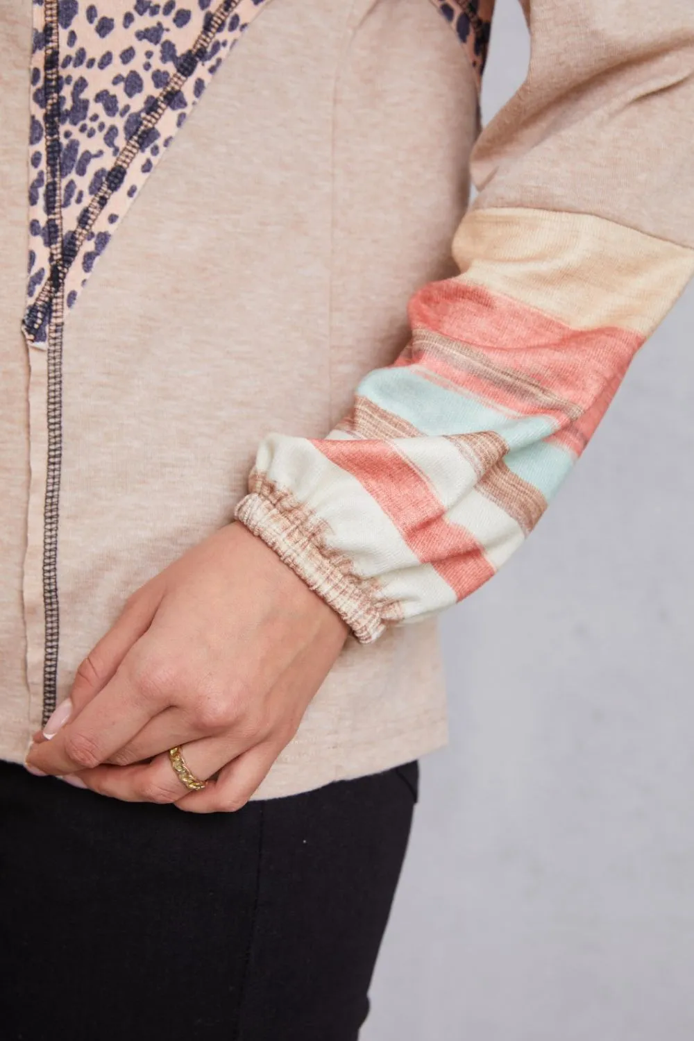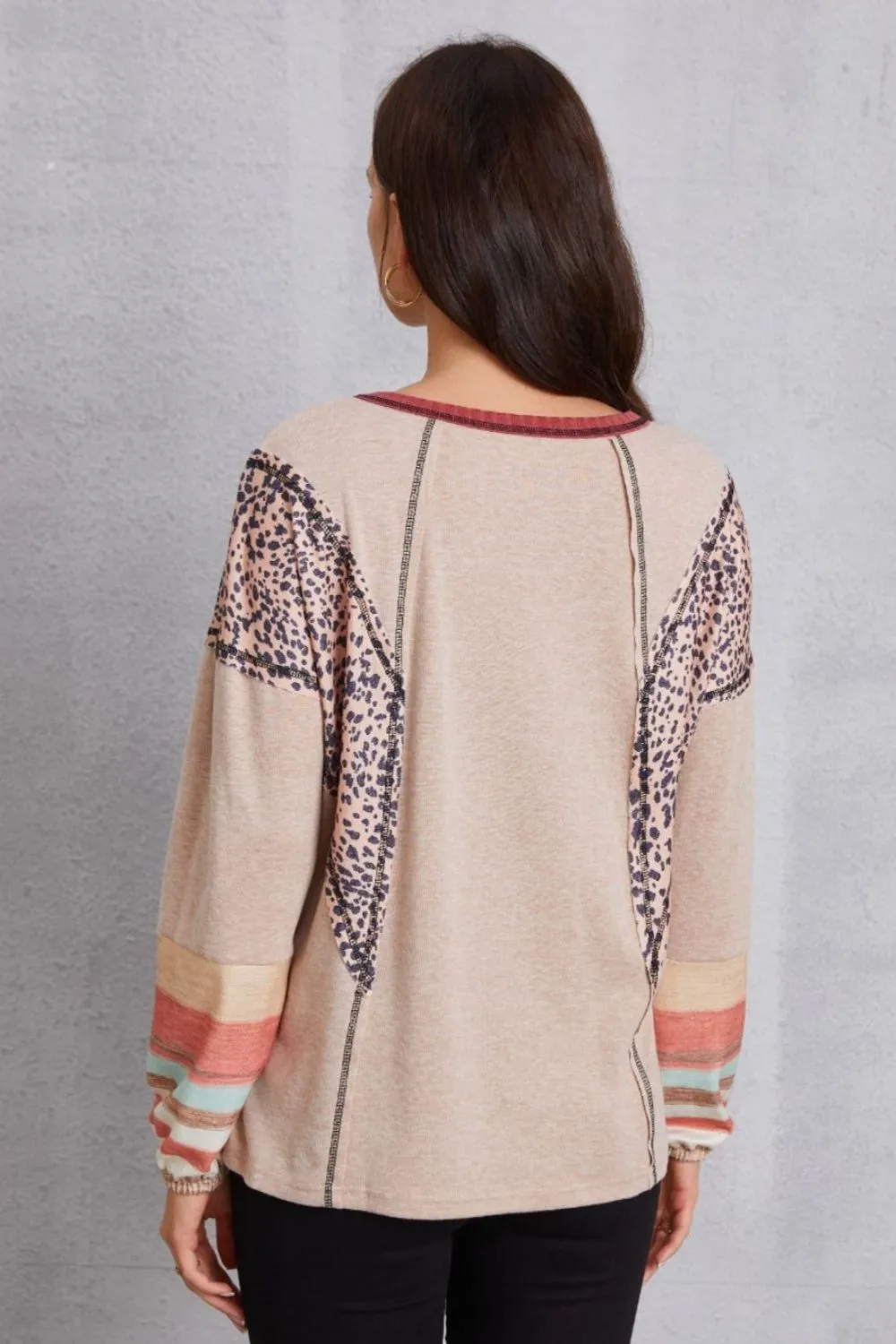 Contrast Stitching Leopard Long Sleeve Blouse