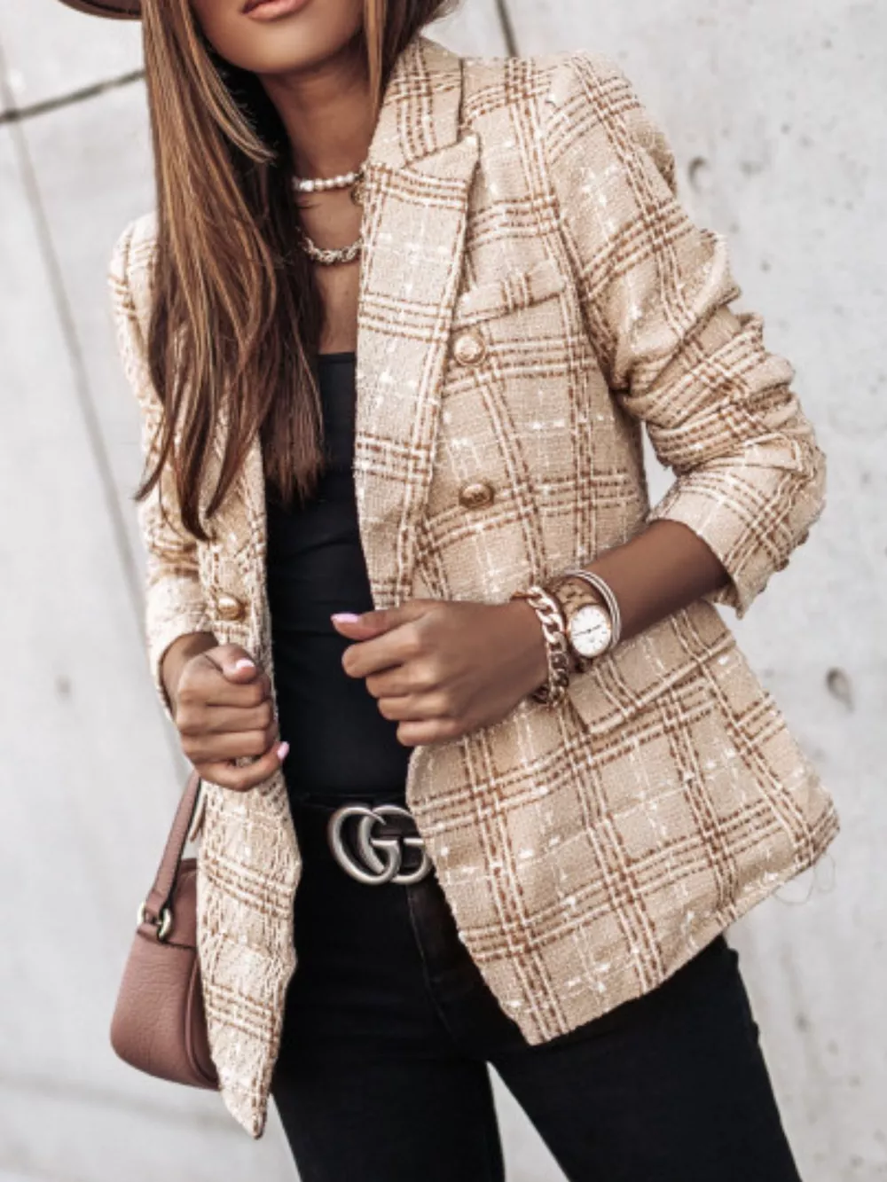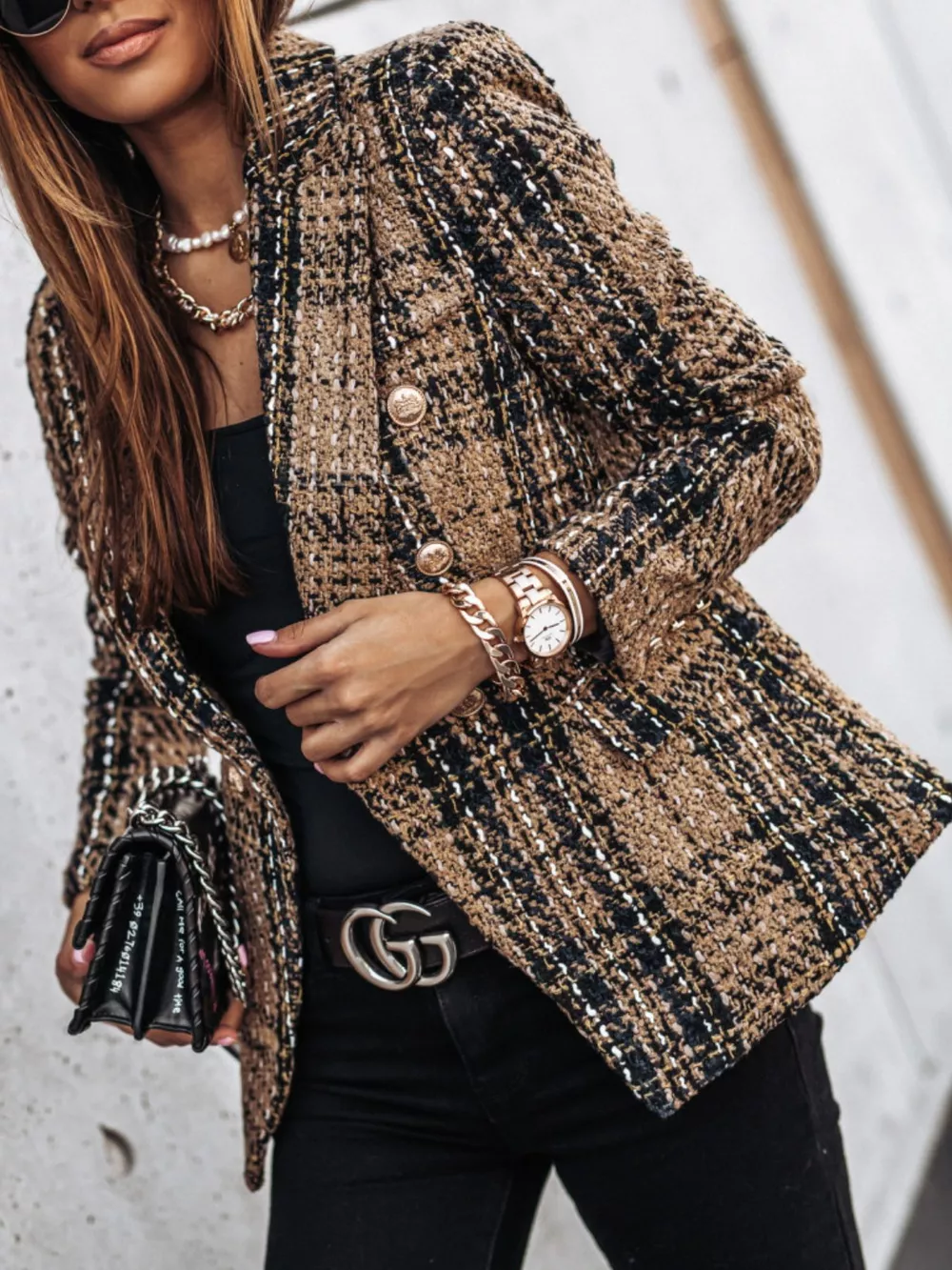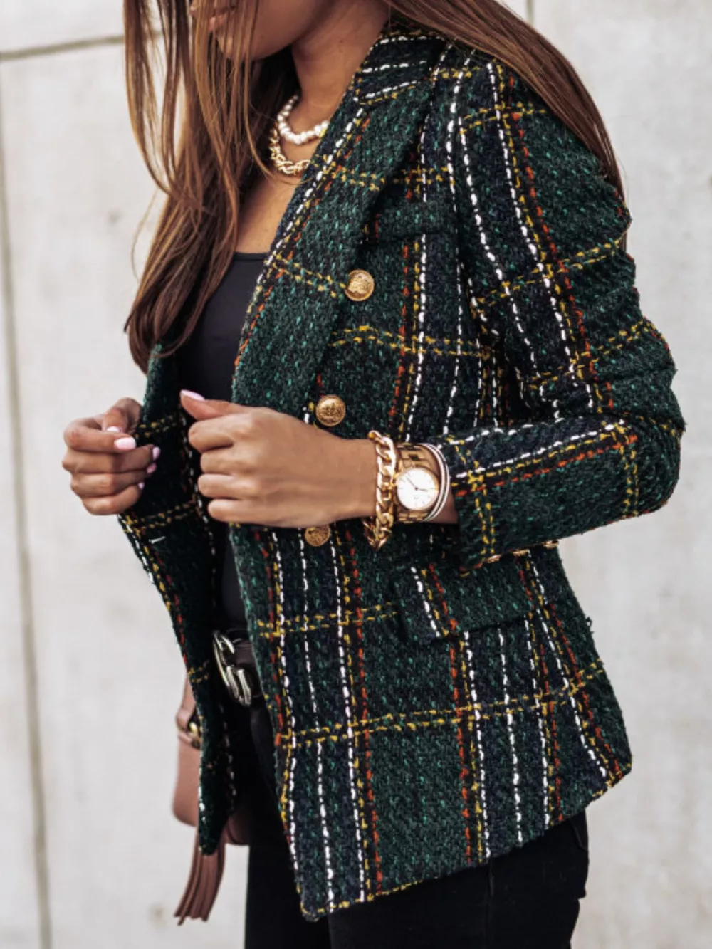 Full Size Plaid Tweed Double-Breasted Blazer Plus Size