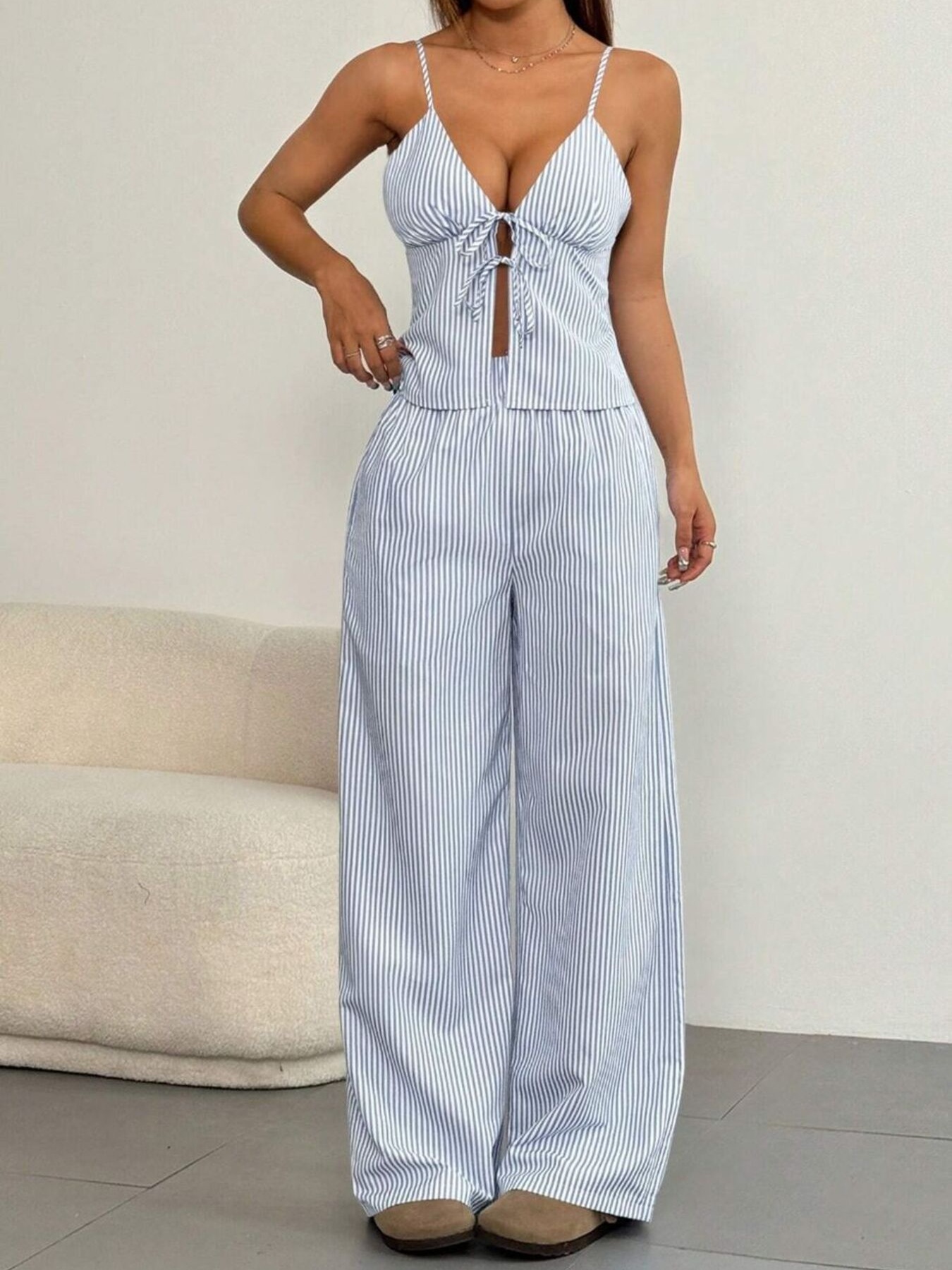 Striped Tie Front Cami And Pants Set