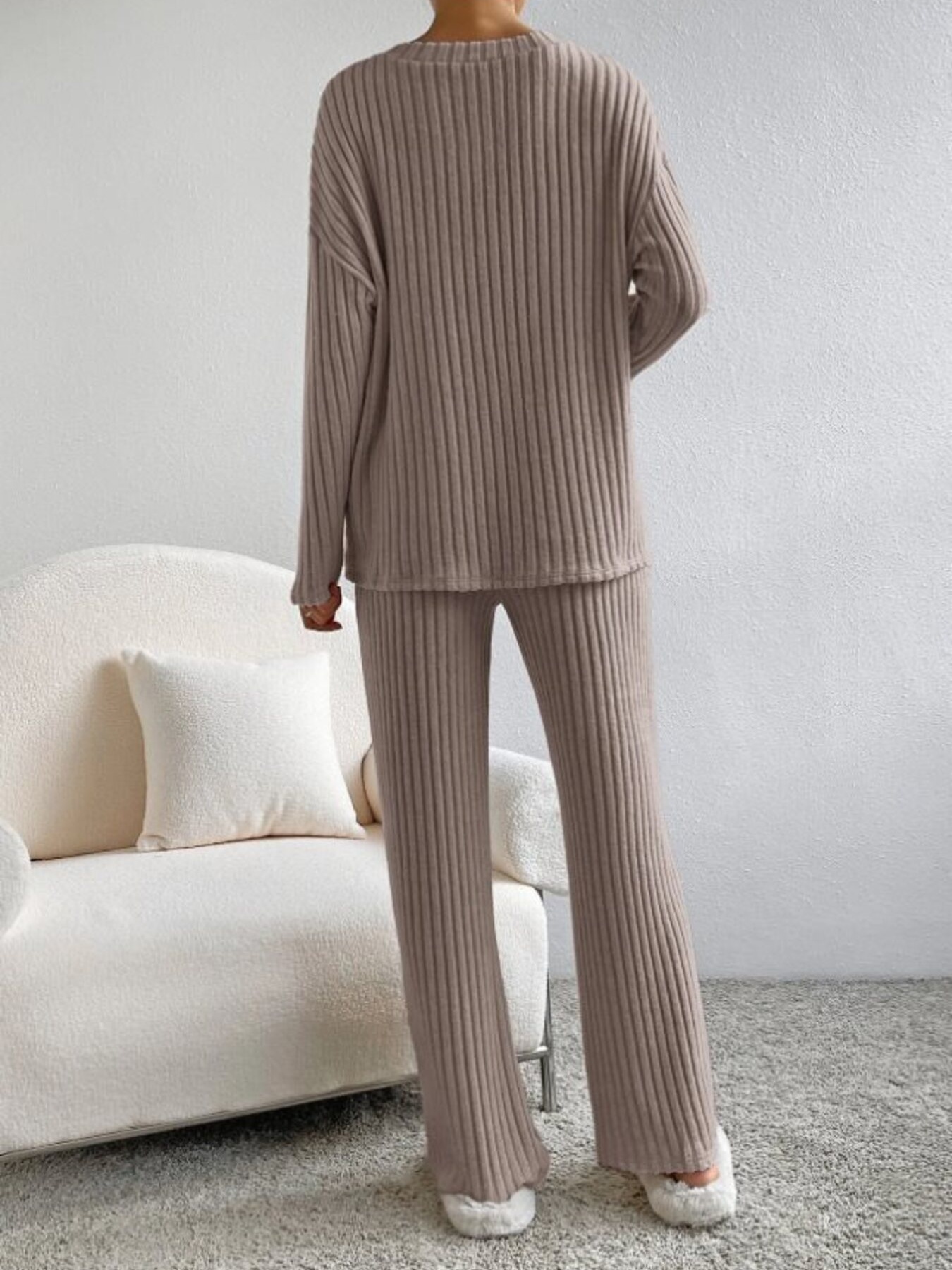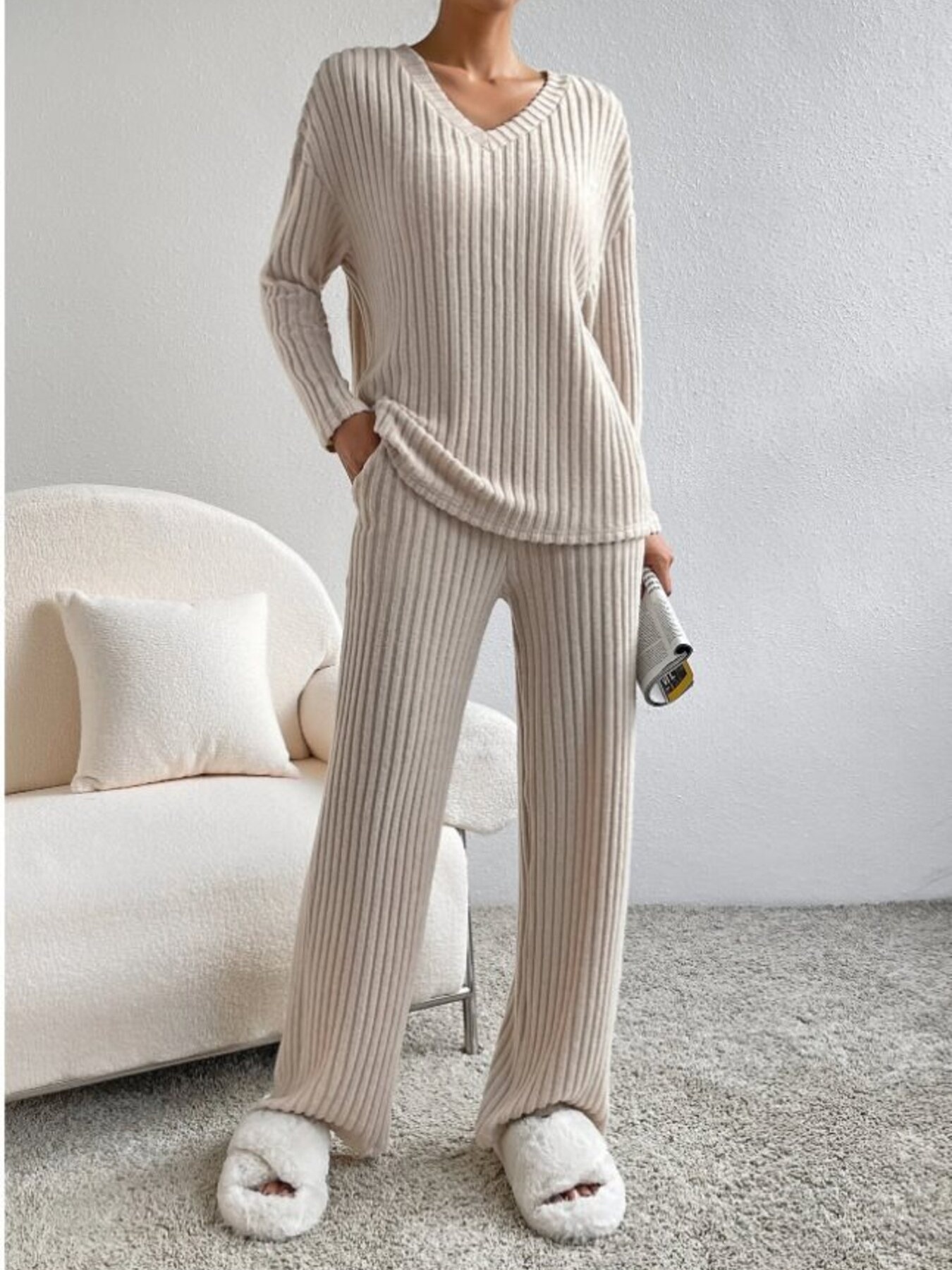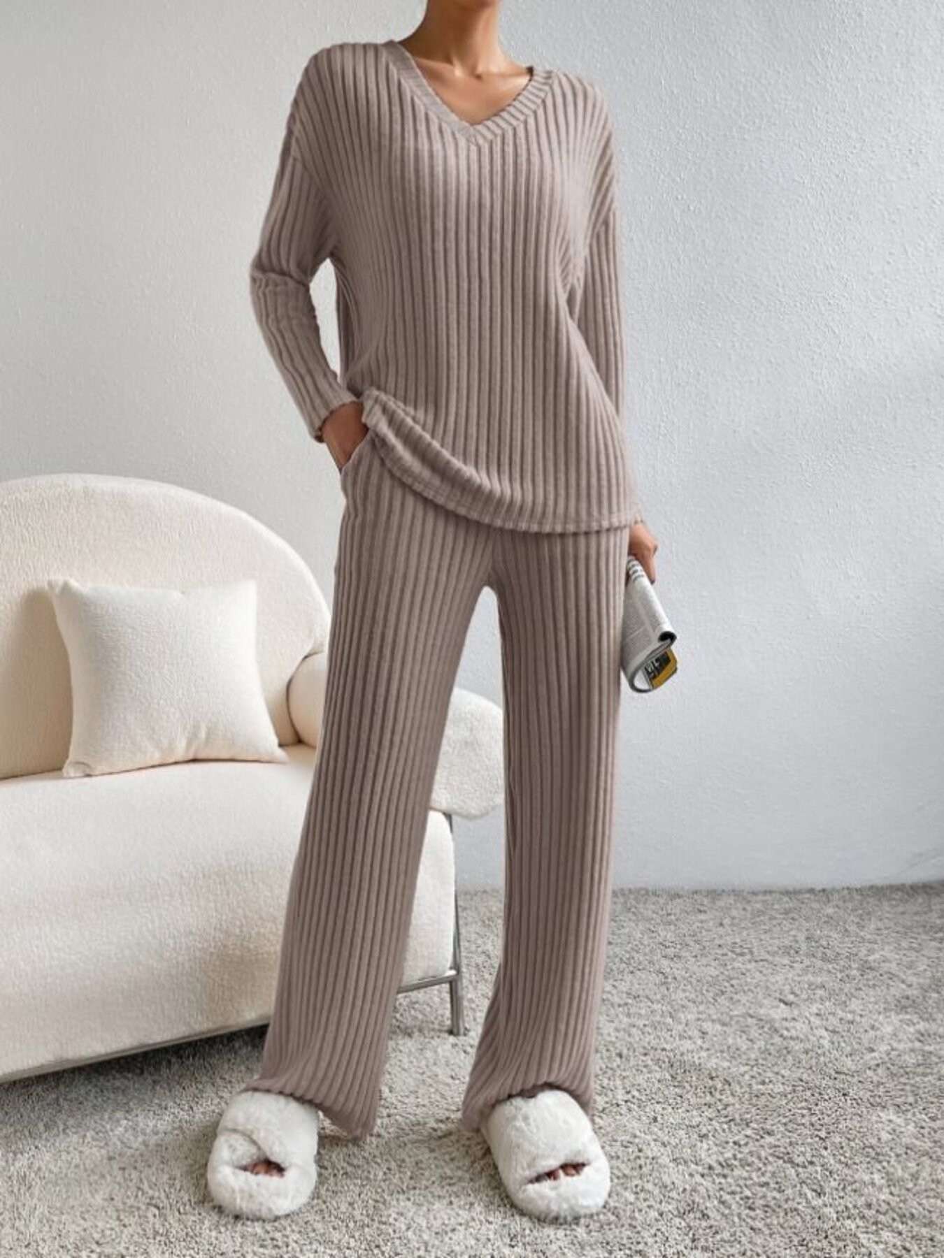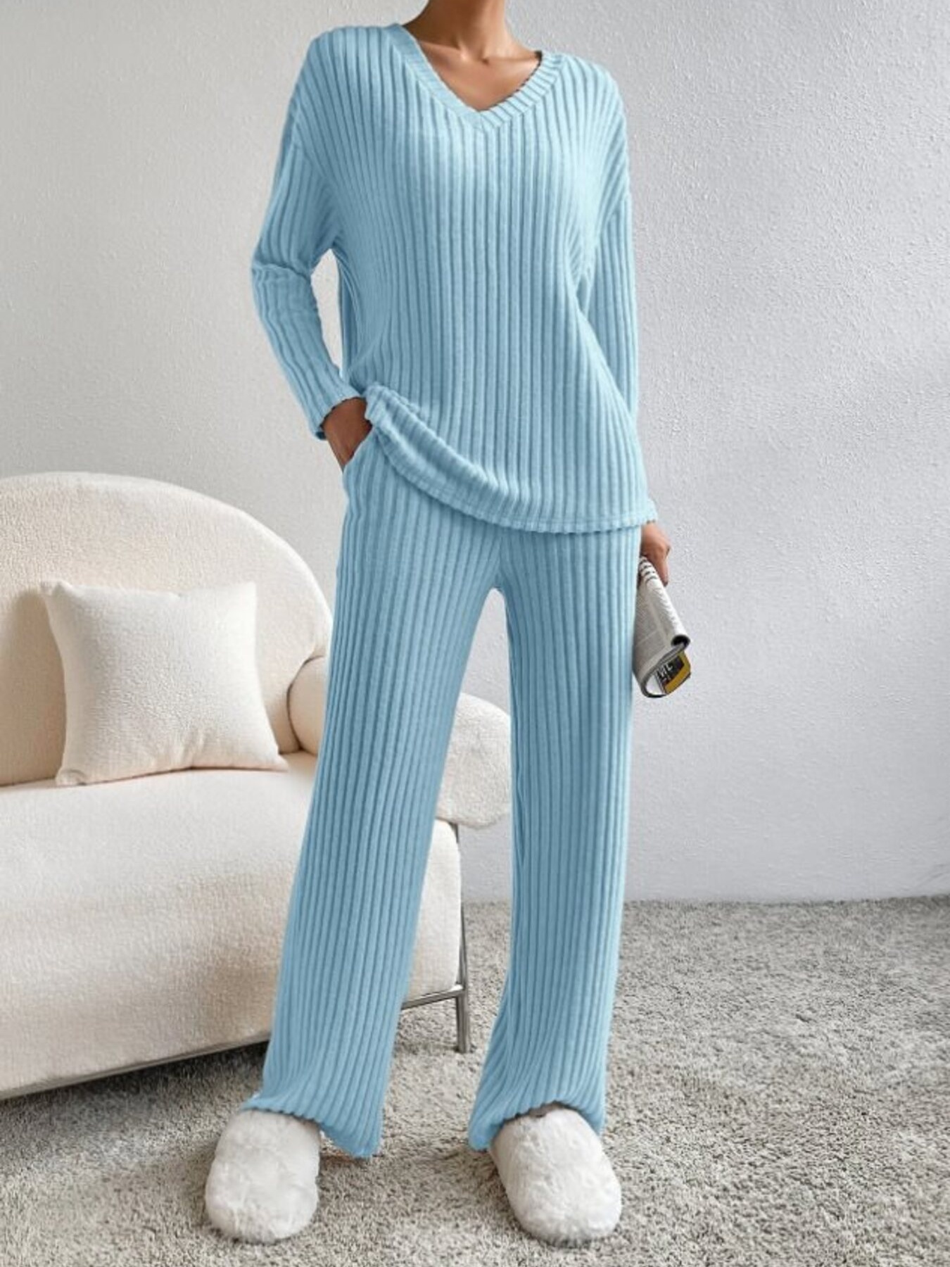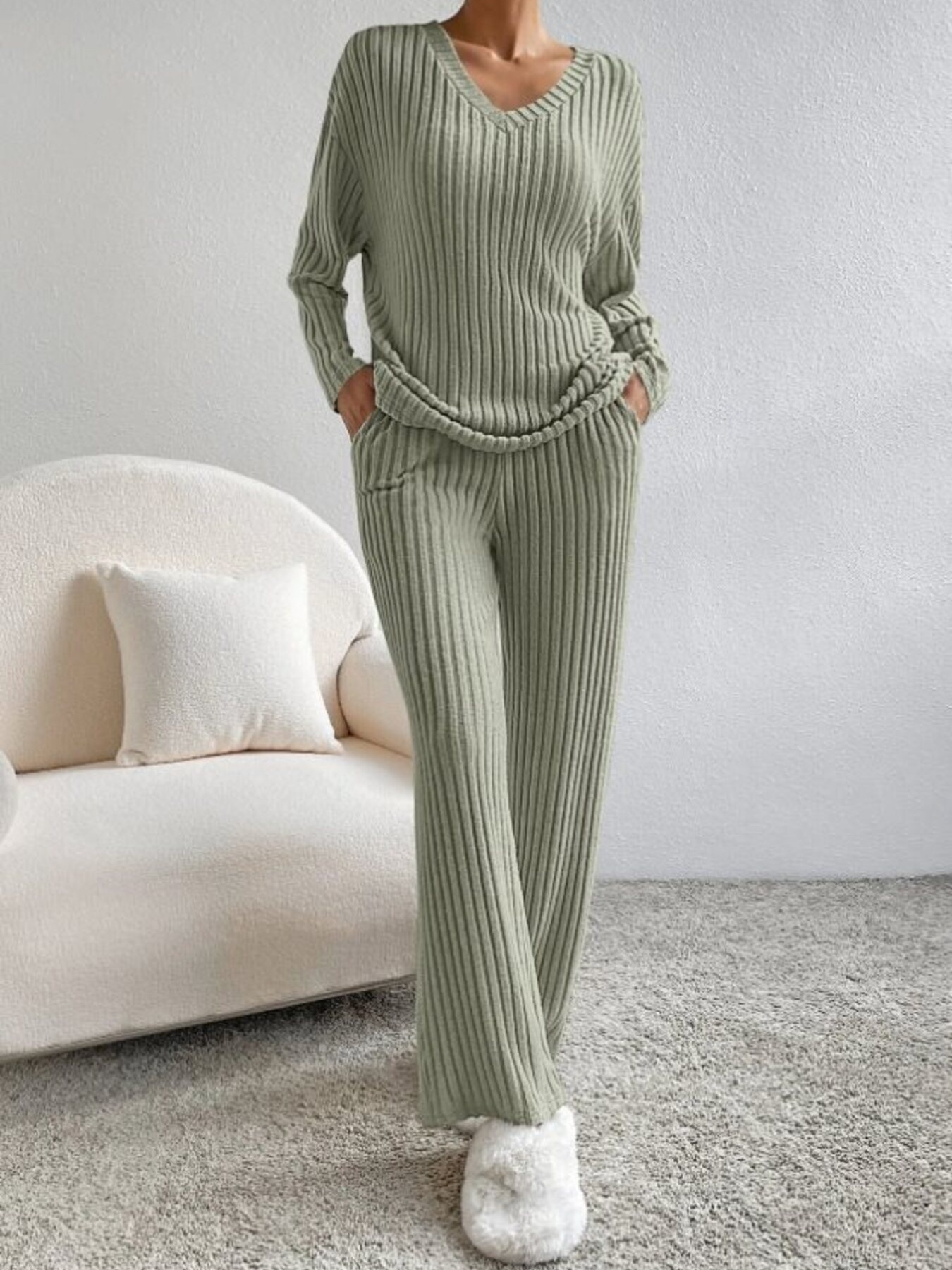 Ribbed Knit V-Neck Top And Pants Set