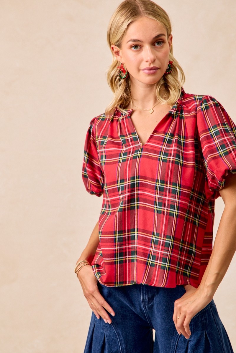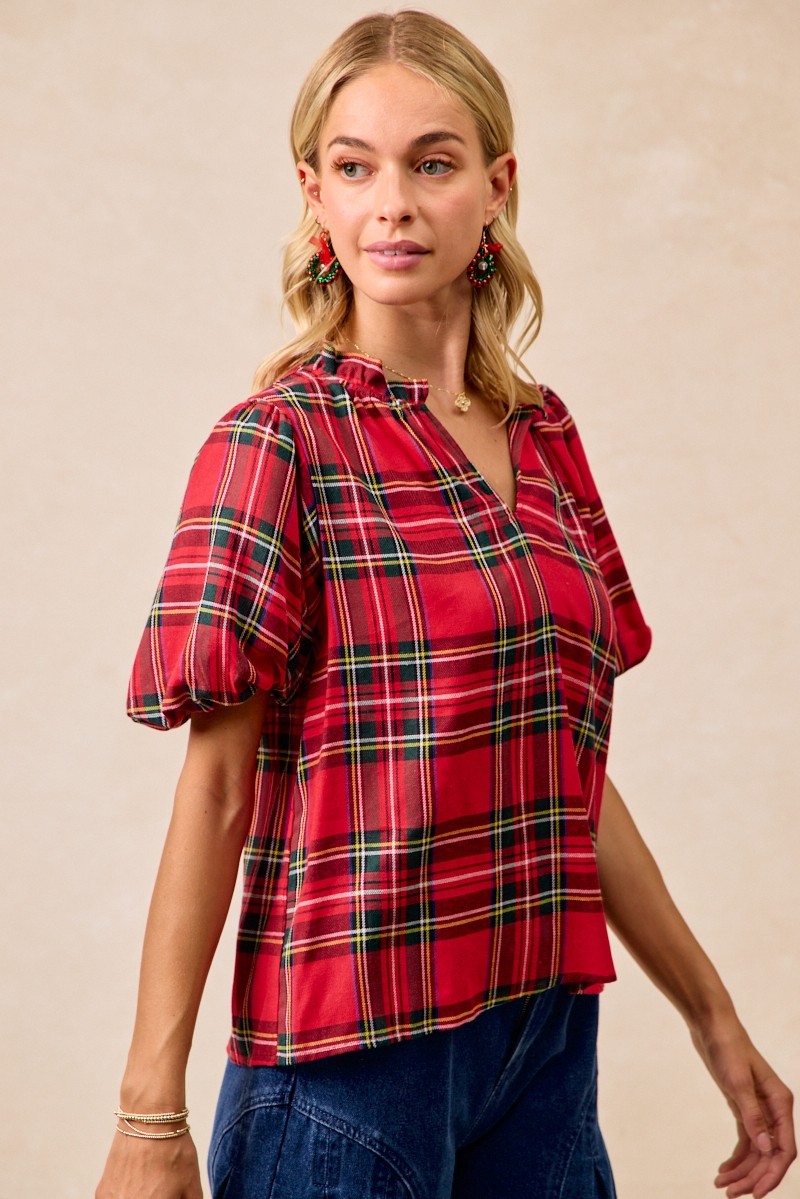 Bibi Christmas Plaid Short Sleeves Ruffled Blouse