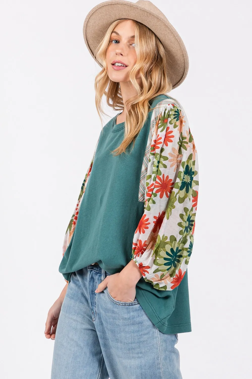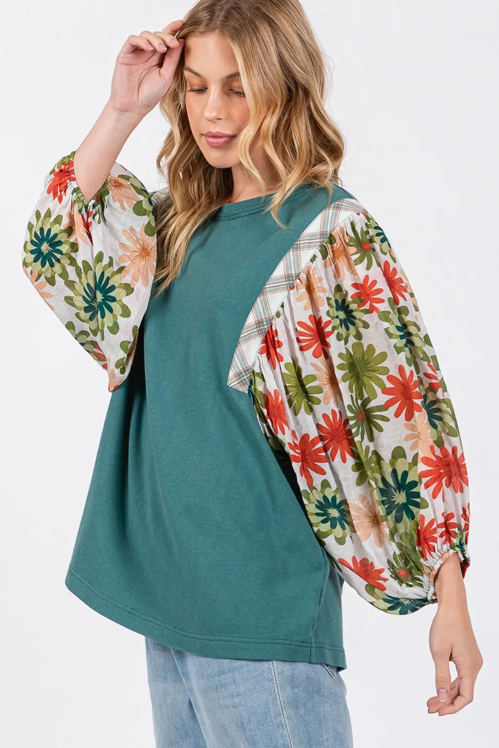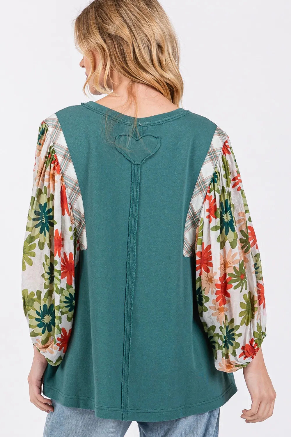 Sage + Fig Full Size Printed Balloon Sleeve Contrast Top