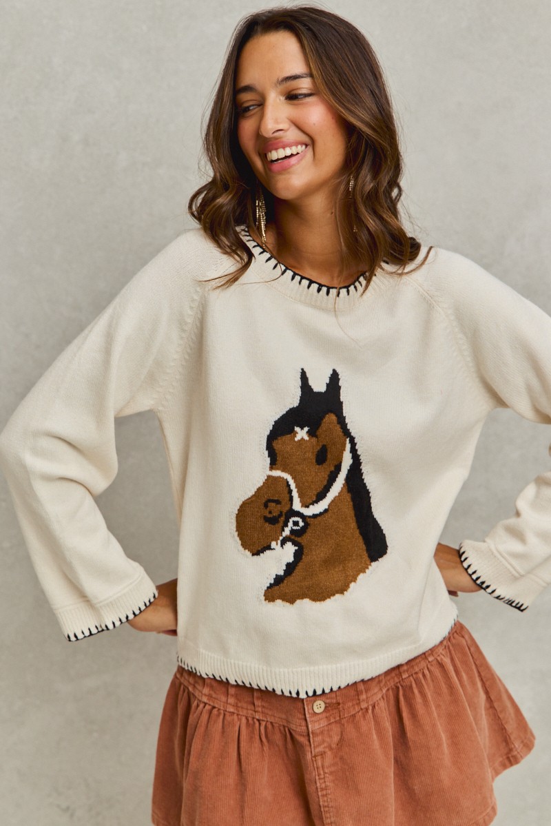 So Me Horse Knit Sweater Top With Blanket Stitch