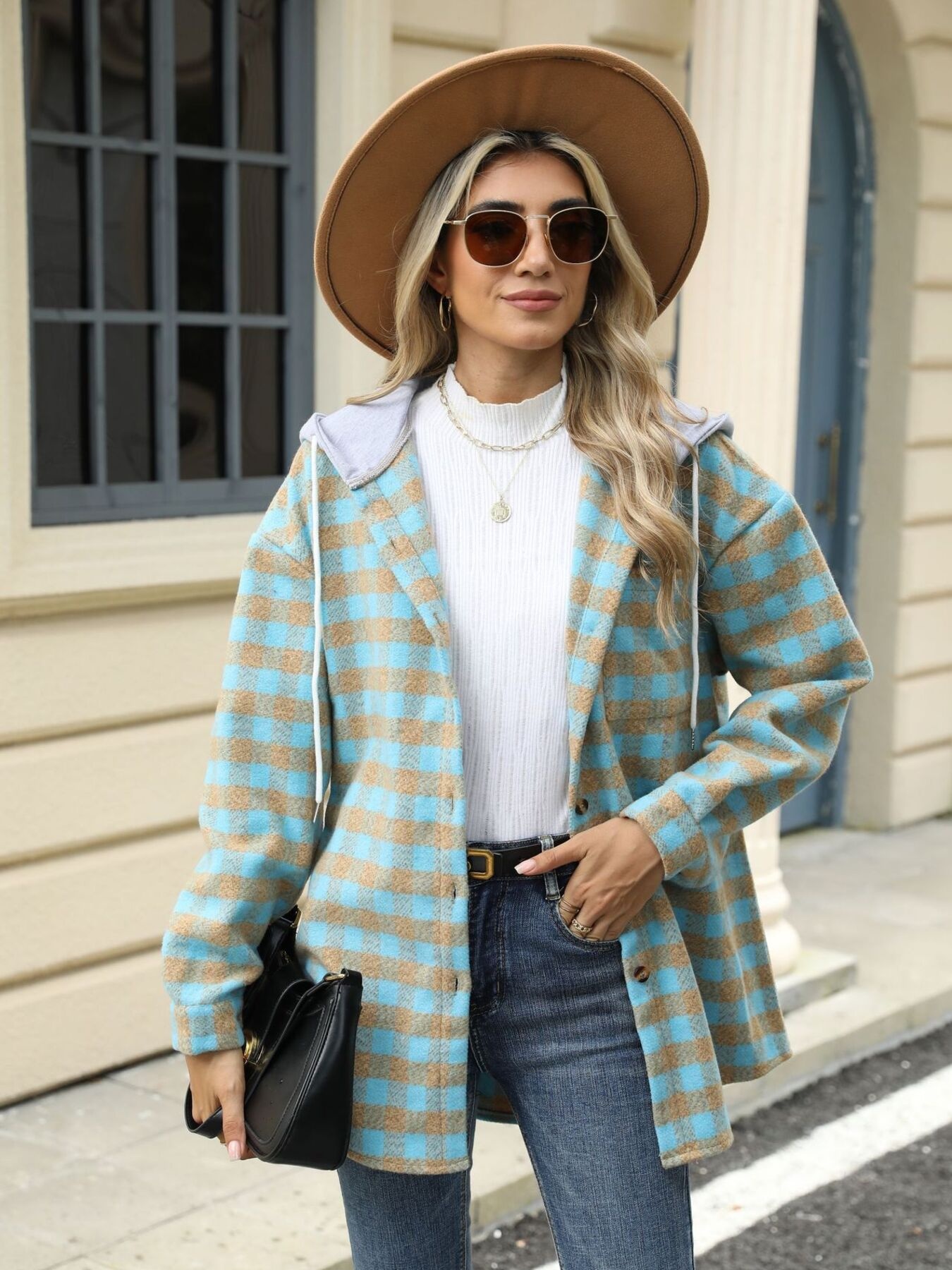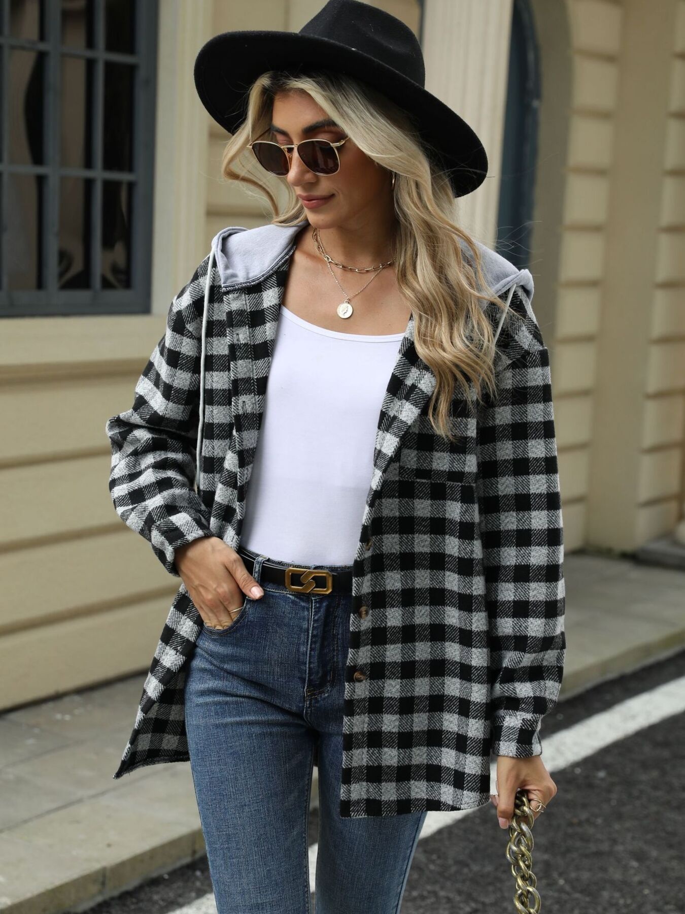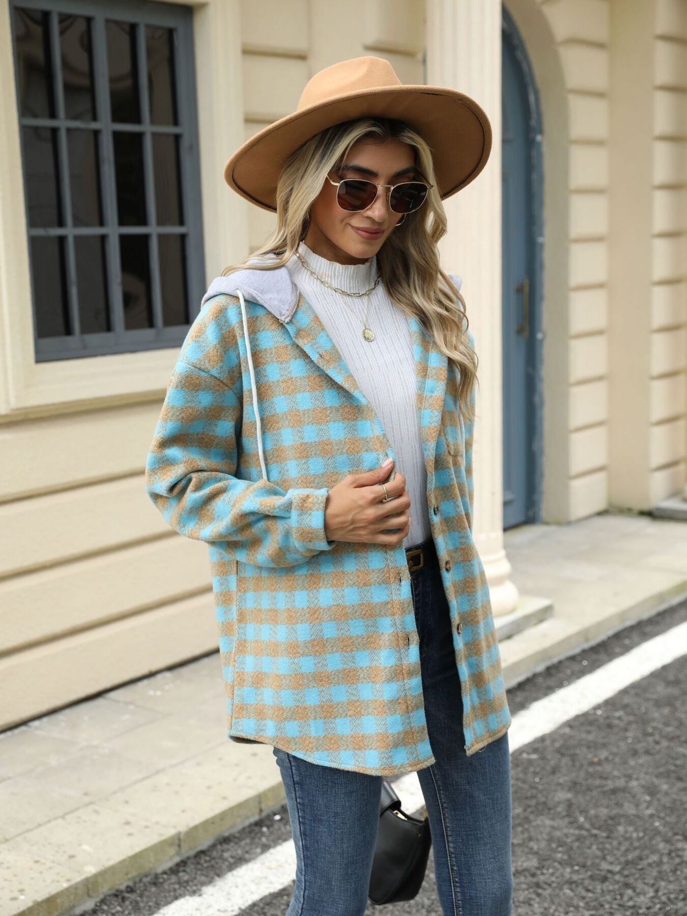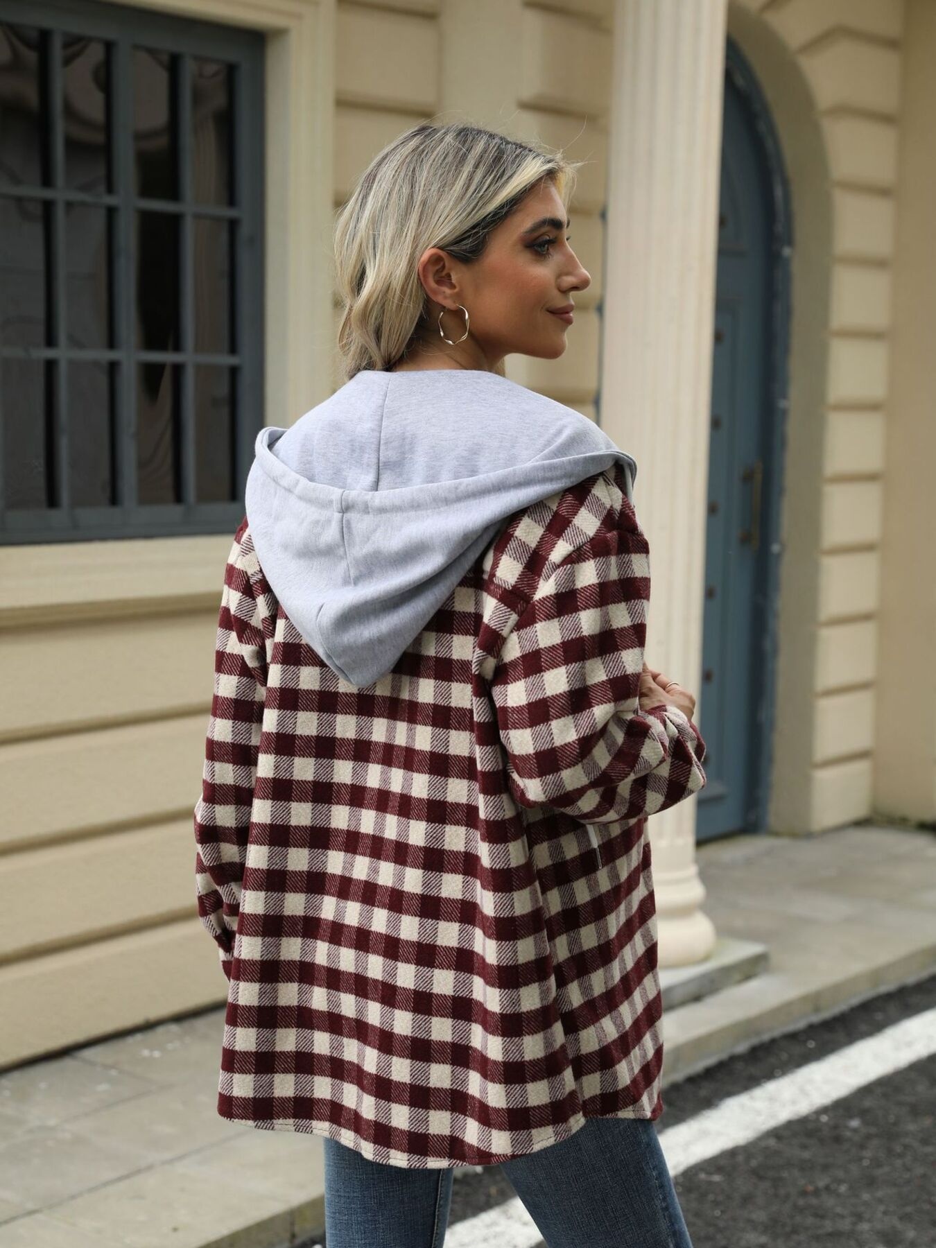 Plaid Button Up Long Sleeve Drawstring Hooded Jacket