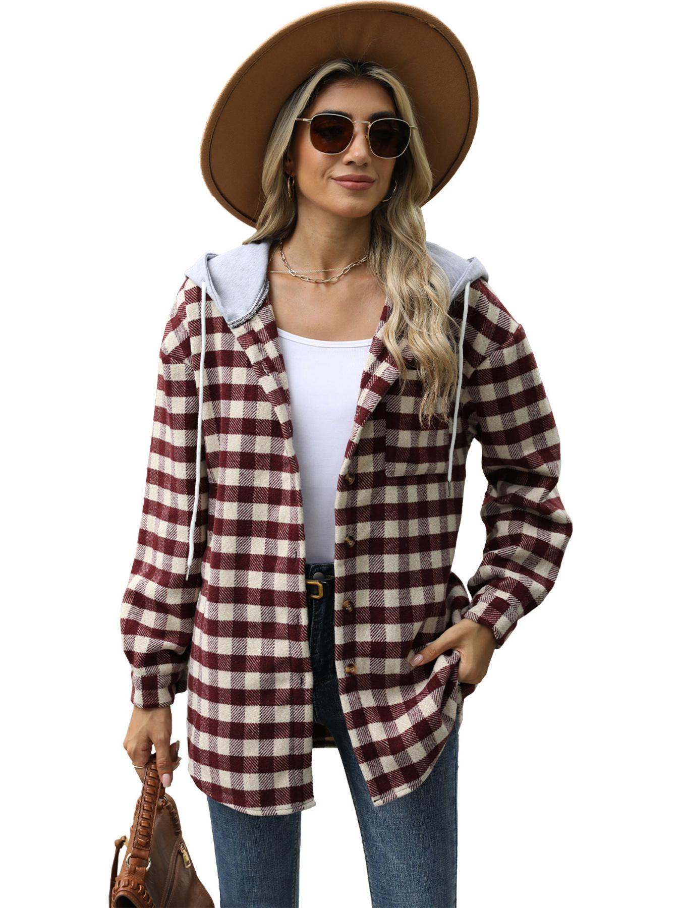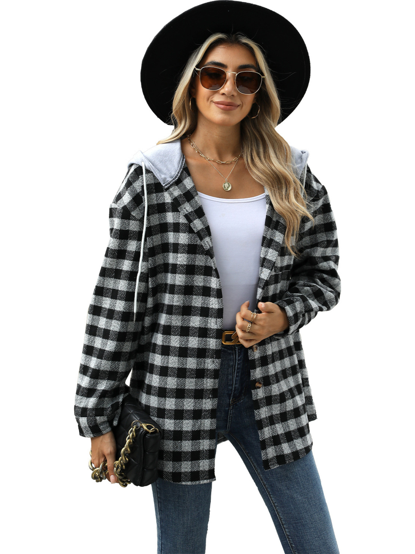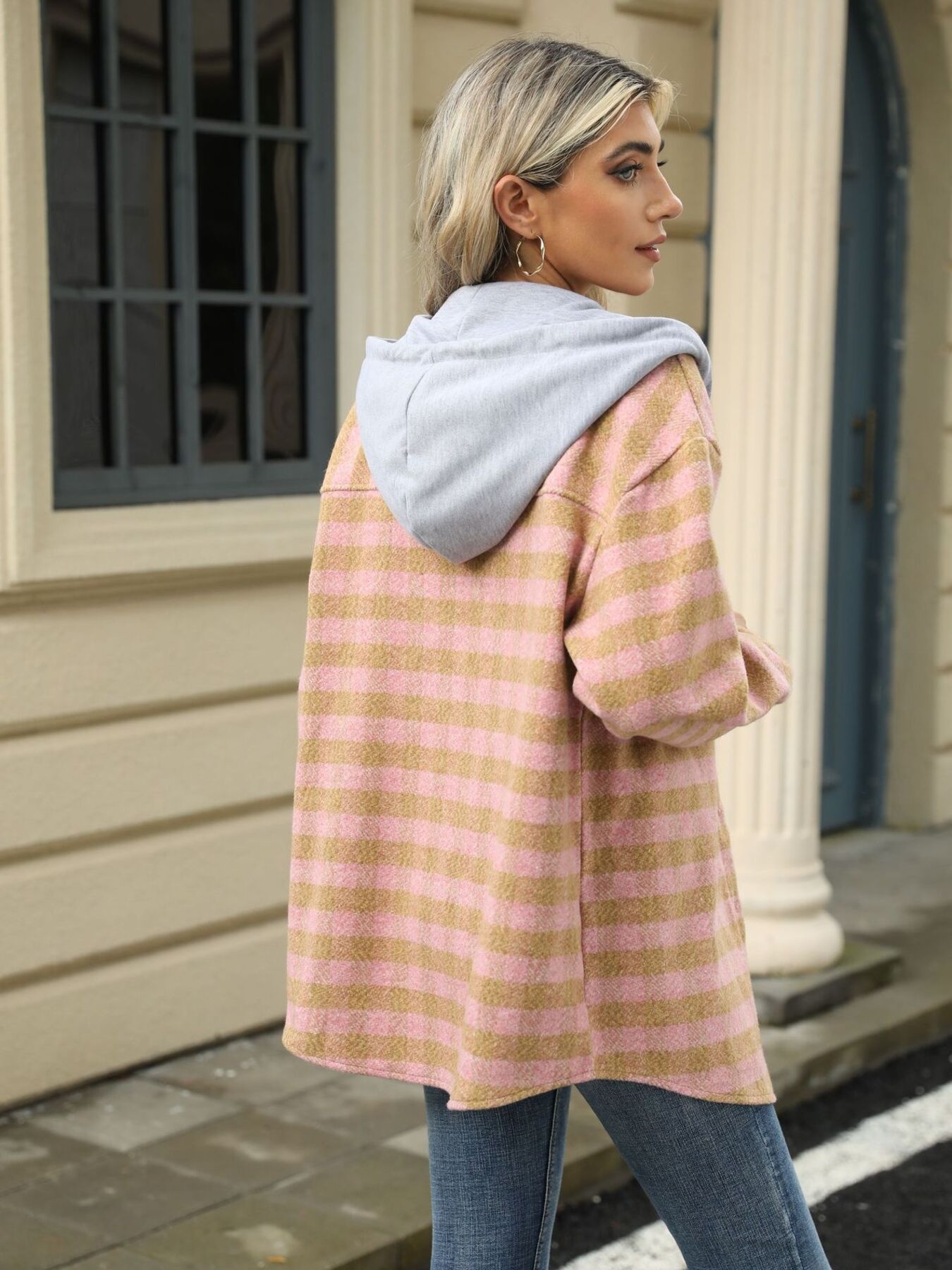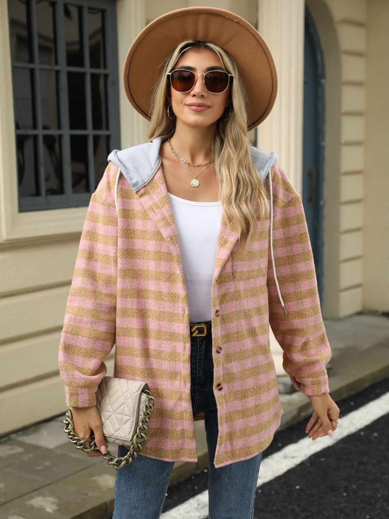 Plaid Button Up Long Sleeve Drawstring Hooded Jacket