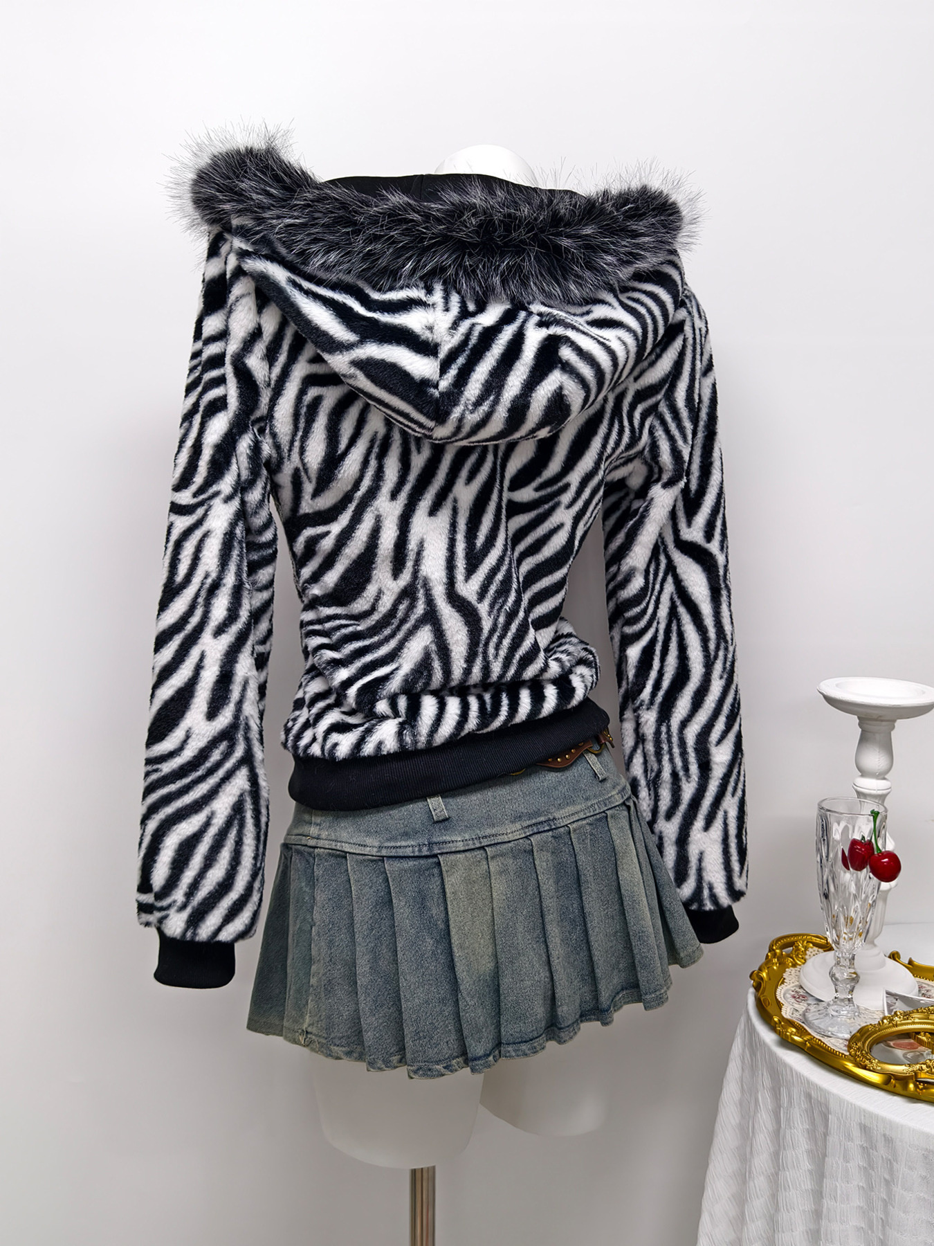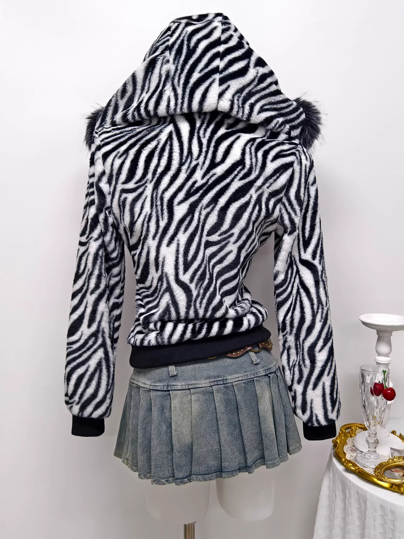 Zebra Faux Fur Hooded Zip-Up Outerwear