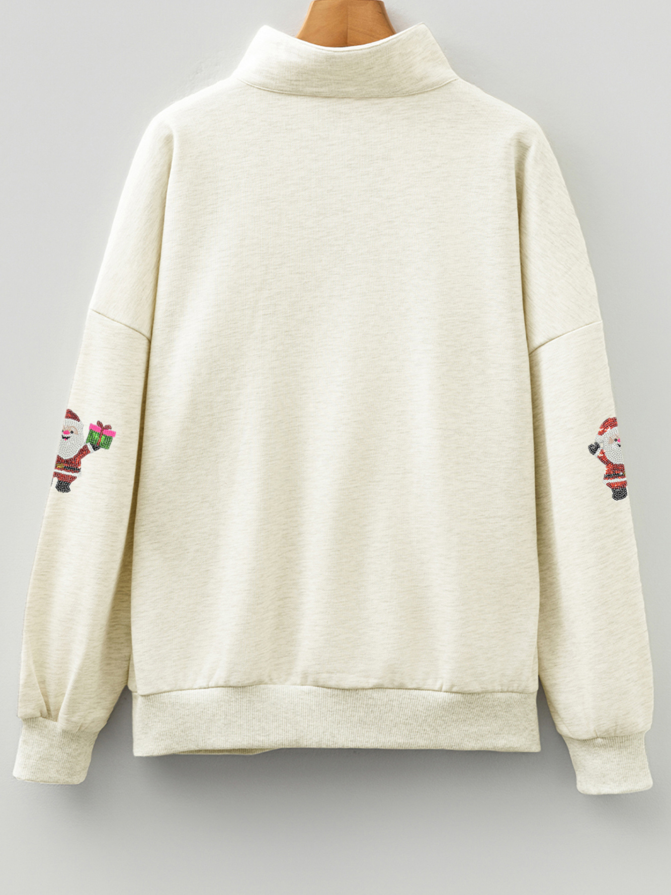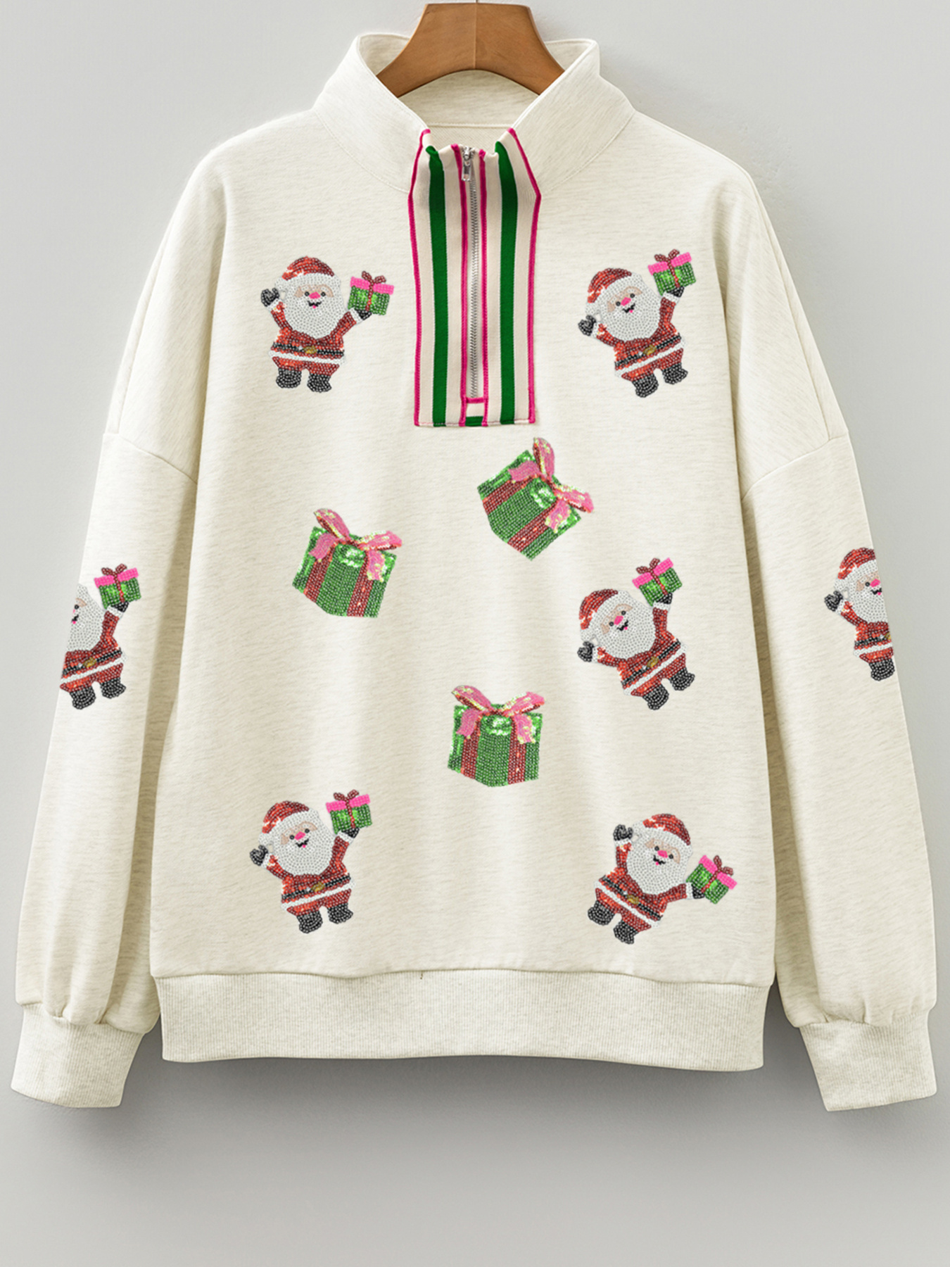 Christmas Striped Patchwork Zip Neck Sequin Santa Gift Sweatshirt