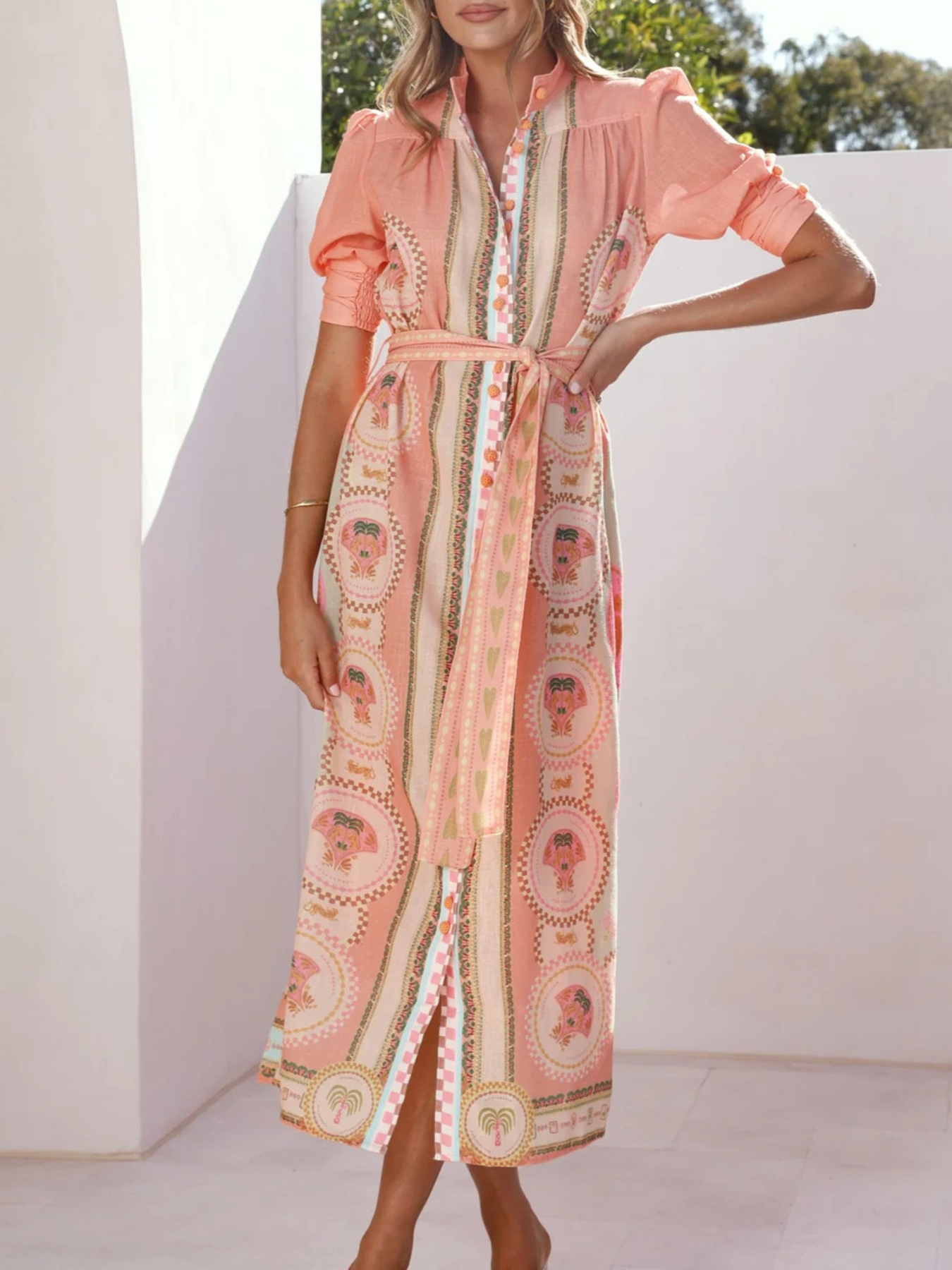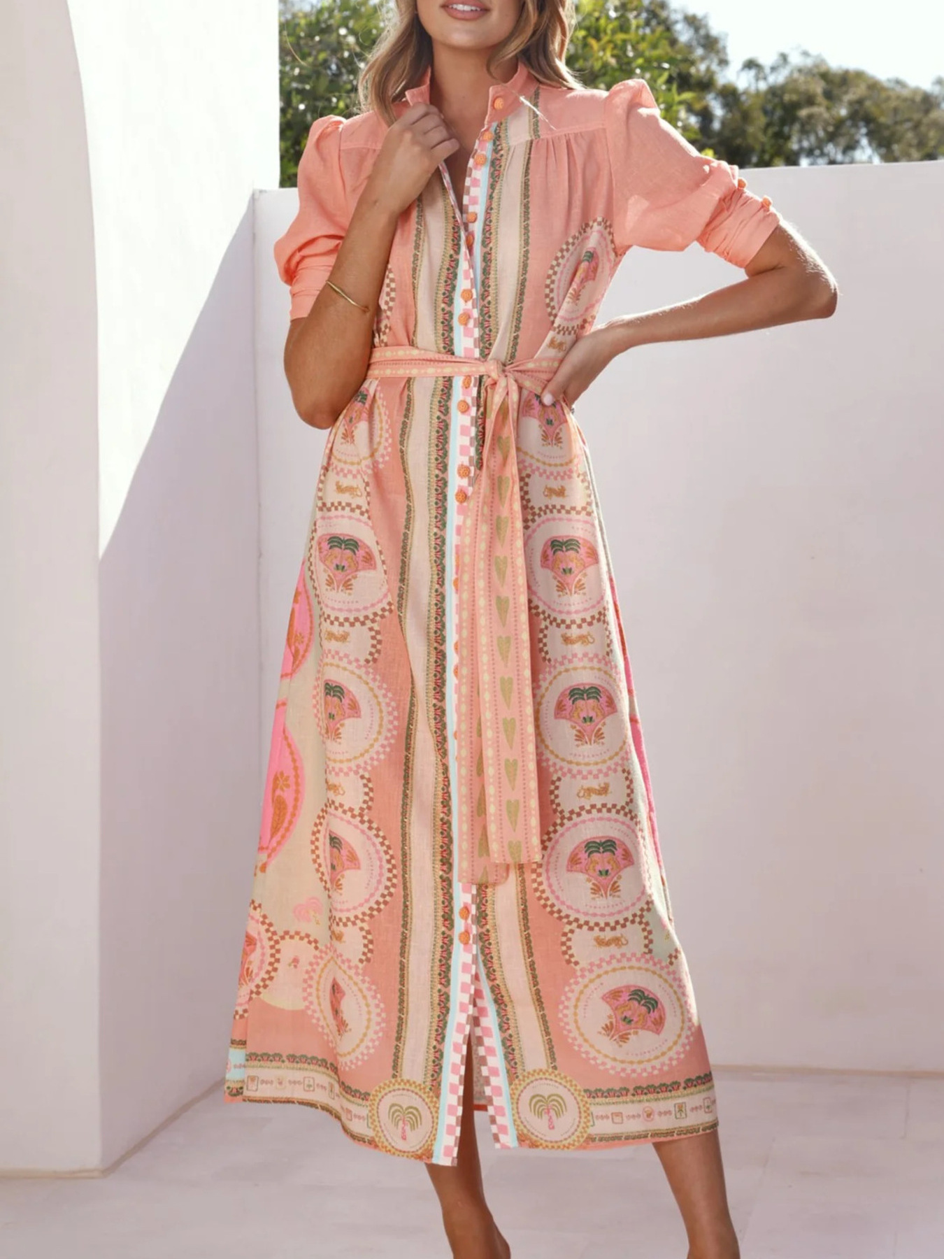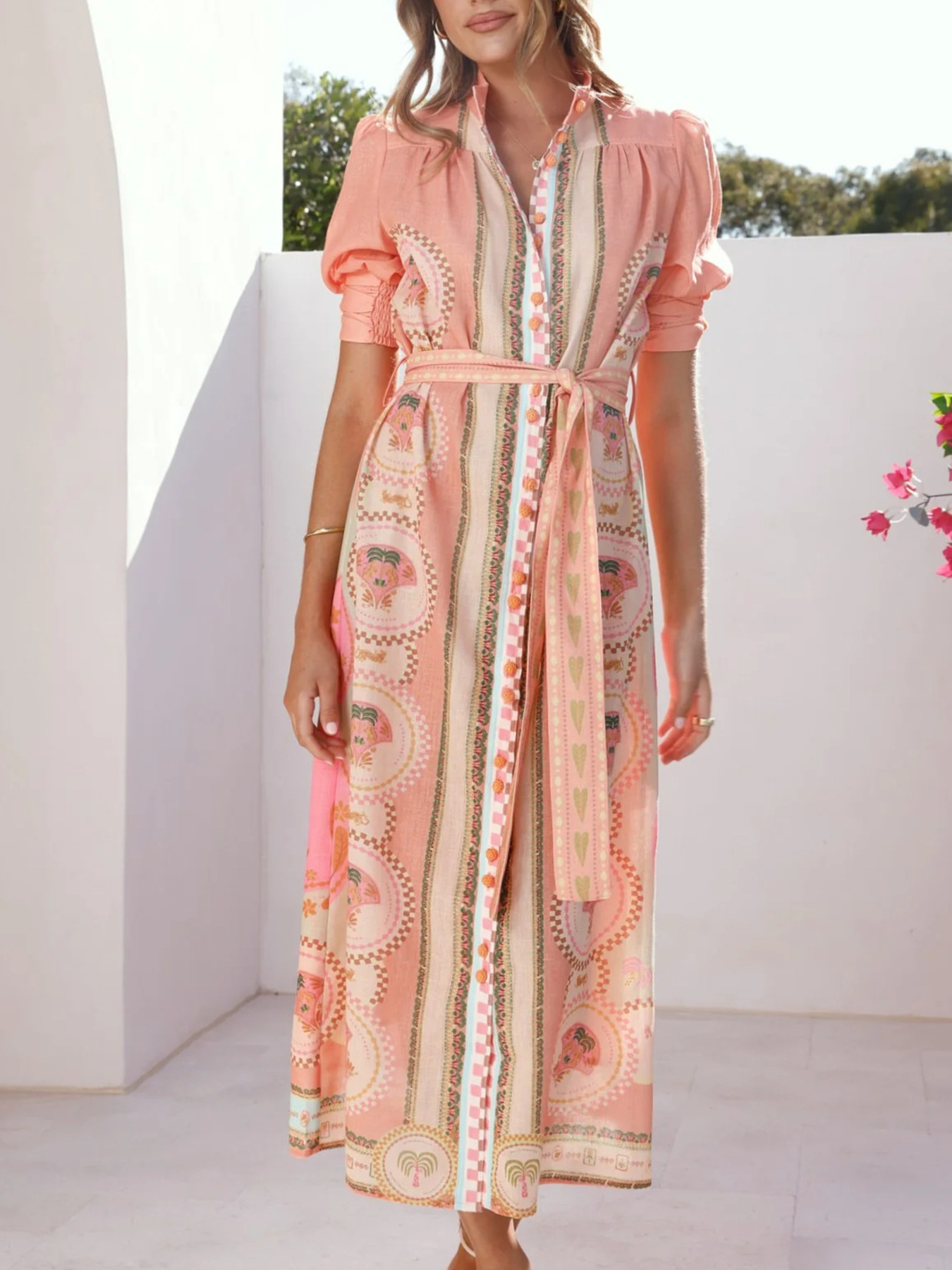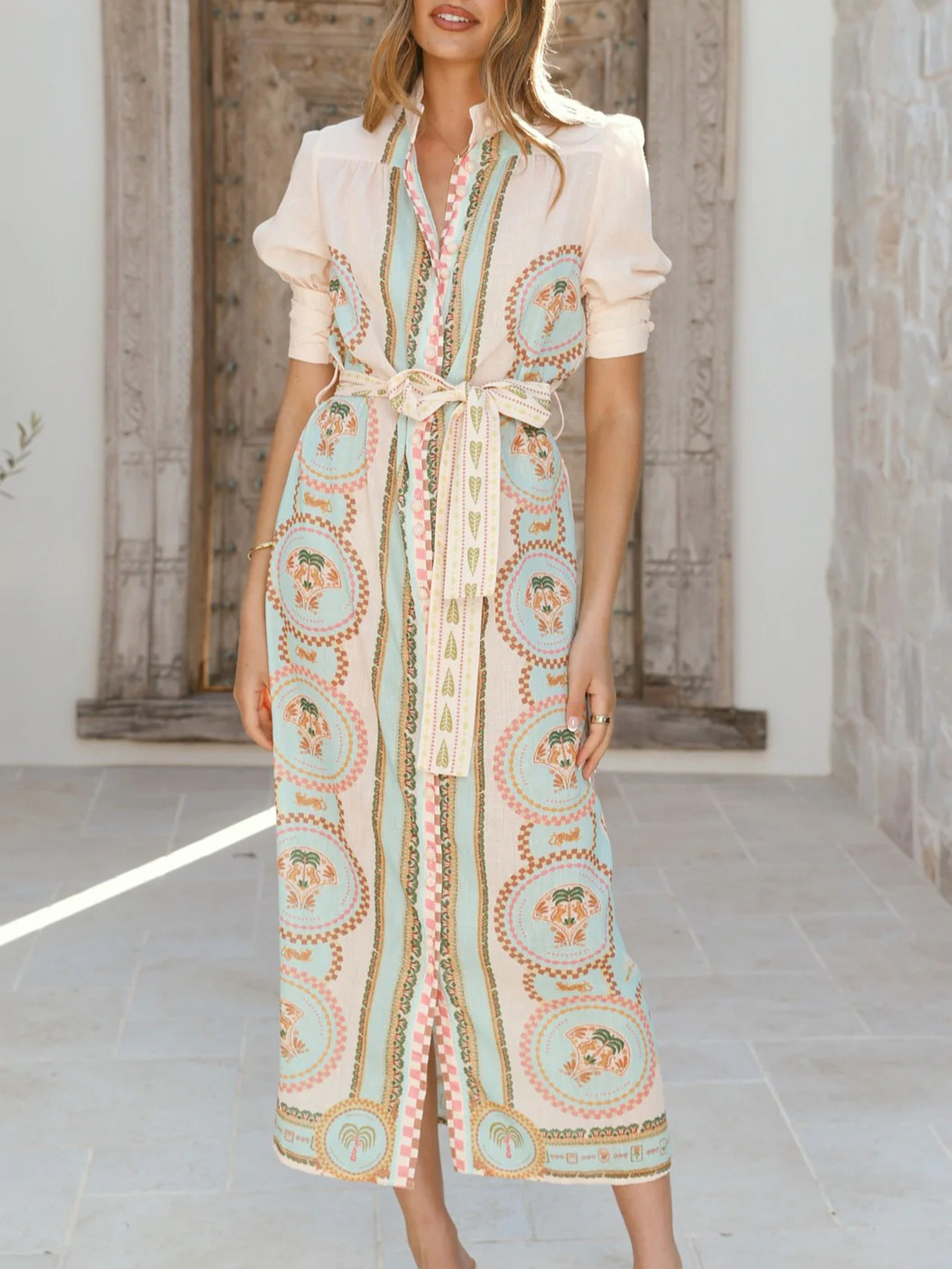 Printed Puff Sleeve Tie Waist Midi Dress