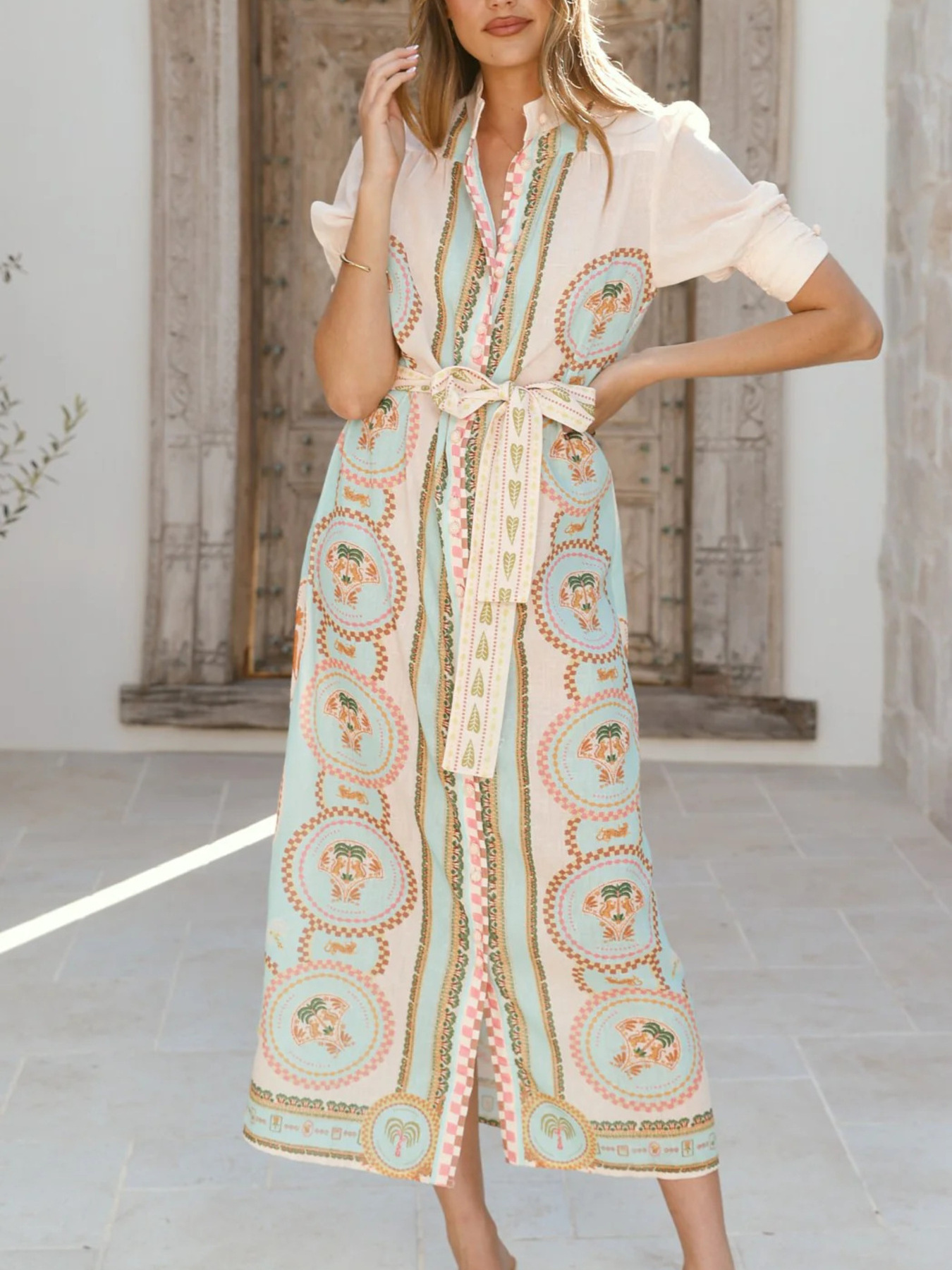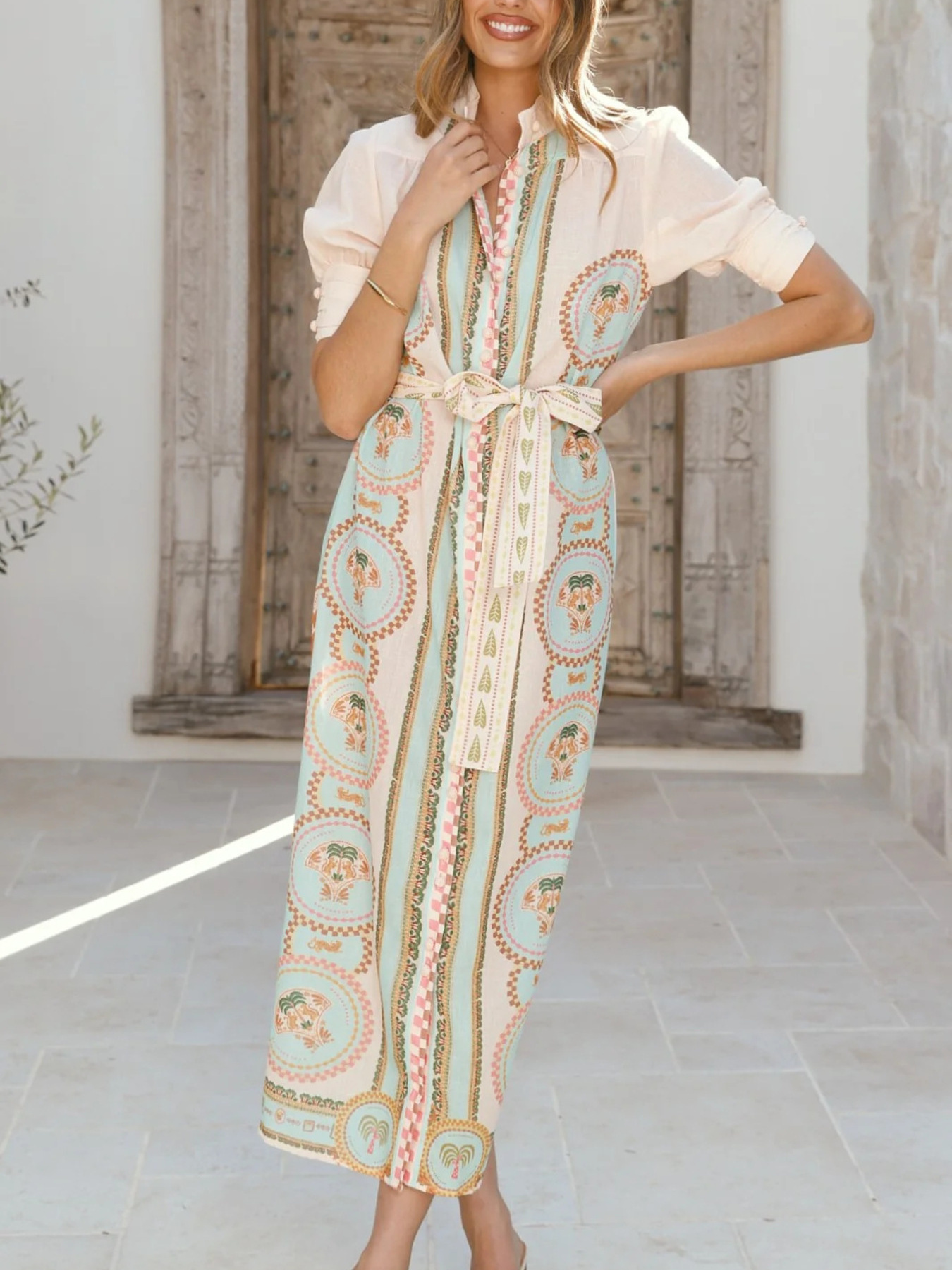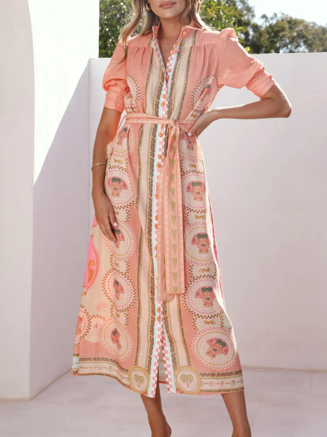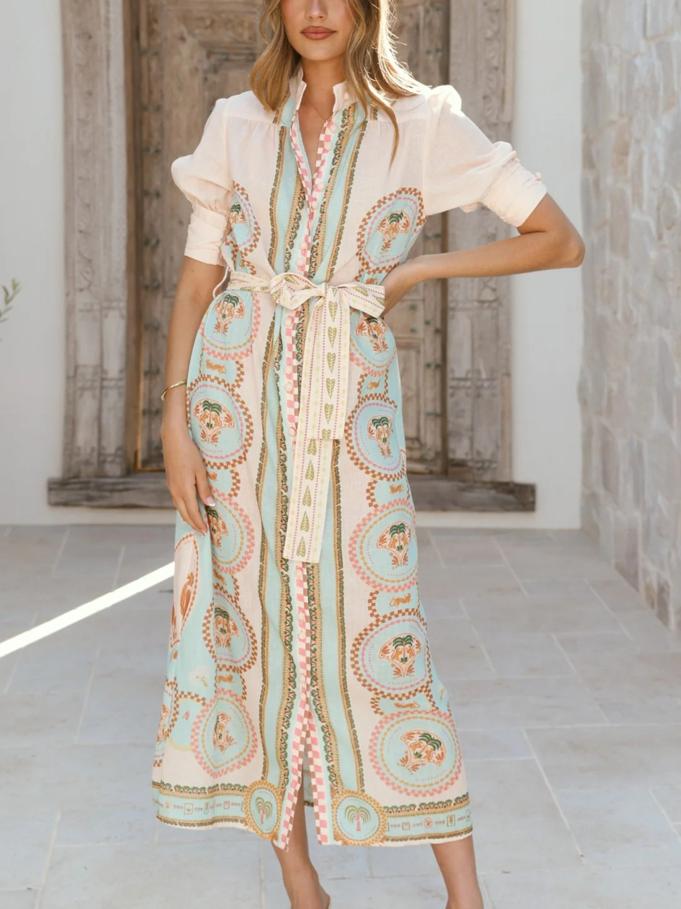 Printed Puff Sleeve Tie Waist Midi Dress